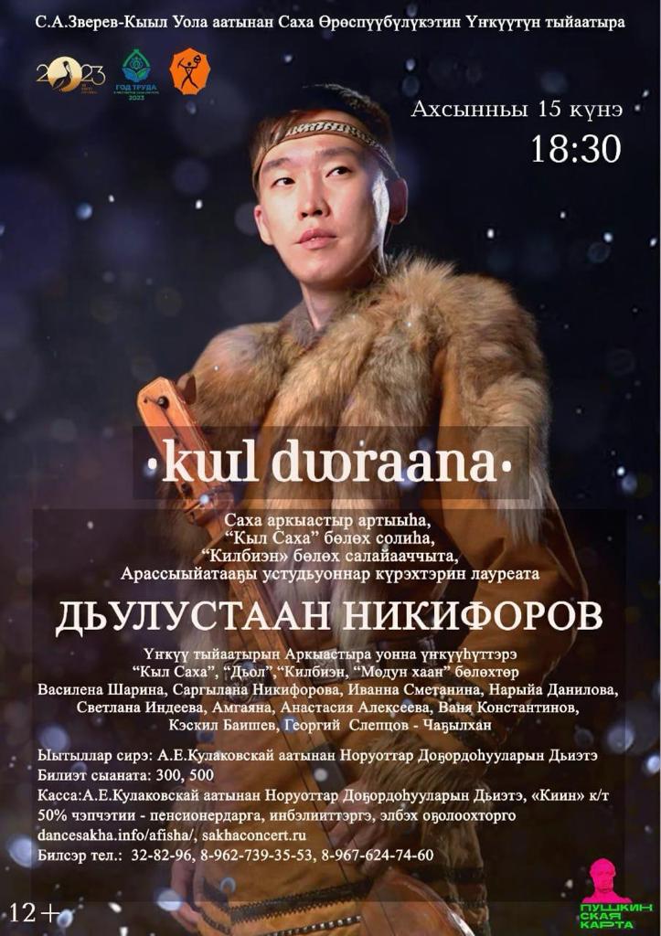 Концерт «Кыл дуораана» состоится 15 декабря в 18:30 в Доме дружбы народов имени Кулаковского. Инструменты, пришедшие через тысячелетия, зазвучат для всех нас. Время не властно над этнической музыкой, и подлинно национальное всегда интернационально. Мировому сообществу мы интересны своей уникальной культурой, которую сохраняют и развивают энтузиасты своего дела, одним из которых является музыкант Дьулустаан Никифоров. Специалистов, преподавателей якутской этномузыки мало, они очень ценятся. Но главное, что Традиция сохранилась, и с каждым годом носителей культуры этномузыки становится все больше. Ведь энтузиасты щедро делятся своими знаниями и опытом. В Якутске впервые состоится концерт, главными инструментами которого станут кыл кылыhах и кырыымпа. Возрождение и популяризация якутской этнической музыки продолжаются.