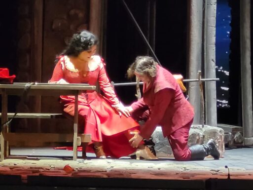 Оба солиста в ярко-красных костюмах, плащах и шляпах, со шпагой демонстрировали хорошую физическую форму, выполняя практически акробатические номера при спуске со второго этажа декораций на круглой люстре со свечными светильниками в виде колеса в таверне Спарафучиля. Для везунчика Герцога, даже из патовой ситуации выходящего сухим из воды – это колесо фортуны. Проводится прямая аналогия также и с пламенем страсти, с которым играет сердцеед. Ради него красавицы, теряя голову, как мотыльки летят в огонь.