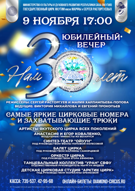 Государственный цирк РС(Я) имени Марфы и Сергея Расторгуевых приглашает всех жителей и гостей столицы 9 ноября в 17:00ч. на юбилейный вечер «Нам 30 лет».