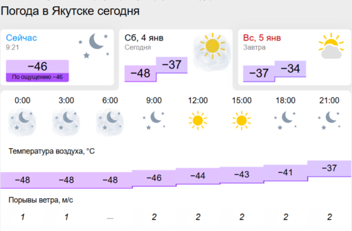 В Якутске ночью ожидается -47-49°, в окрестностях до -52°. Осадков практически нет, обещают туман и ветер западный 1–3 м/с.