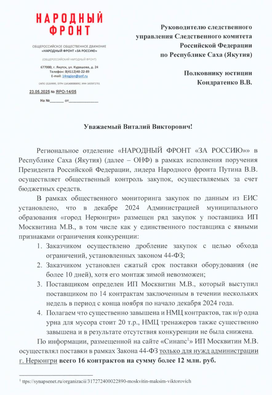 Они ставят вопросы по особенностям закупки спортивных тренажёров администрацией города Нерюнгри в декабре 2024 года. Обращают внимание, что были разбиты лоты, хотя фактически это была одна закупка спортивных тренажеров. Спортивные тренажёры были оплачены администрацией города Нерюнгри, то есть это бюджетные средства.
