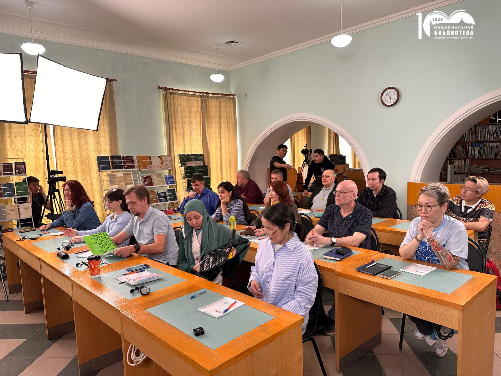 Режиссер, пять операторов, пять камер, световое оборудование, сенсорная панель вместо привычной доски — медиацентр Национальной библиотеки Якутии подошел к съемкам основательно, привлечены студенты-операторы из Якутского колледжа культуры и искусств им. А.Д. Макаровой, которые проходят стажировку на проекте. Команда профессионалов медиацентра создает все условия для комфортной и продуктивной работы, обеспечивая качественную картинку и звук.