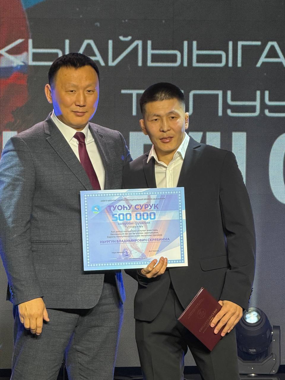 Глава Мегино-Кангаласского улуса Дмитрий Тихонов вручил борцу Ньургуну Скрябину сертификат на 500 000 рублей. Спортсмена, завершившего яркую спортивную карьеру, внесли в Книгу Почета «Мэнэ аат» Мегино-Кангаласского улуса 👏🏼
