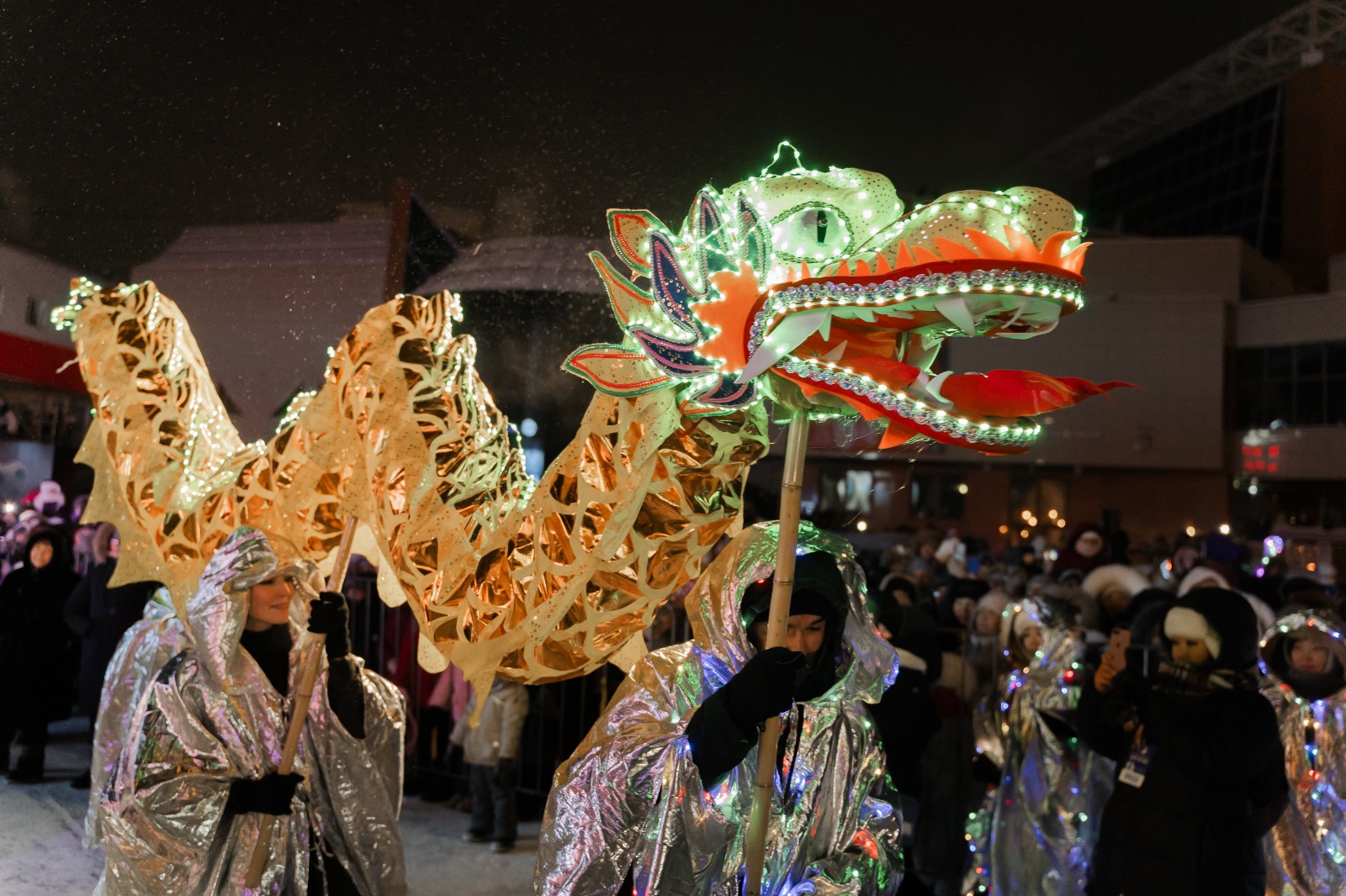 По команде гостей праздника зажглась главная елка Якутска. В этот момент началось еще одно незабываемое событие — с ул. Орджоникидзе и ул. Дзержинского по проспекту Ленина до ул. Петровского проследовала праздничная автоколонна транспортных средств ведущих предприятий города Якутска, украшенных иллюминацией.