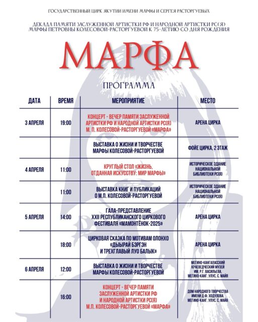 4 апреля в 11:00 ч в историческом зале Национальной библиотеки РС(Я) состоится круглый стол 🌟«ЖИЗНЬ, ОТДАННАЯ ИСКУССТВУ: МИР МАРФЫ» к 75-летию заслуженной артистки Российской Федерации и народной артистки РС(Я) Марфы Колесовой-Расторгуевой. Мероприятие пройдет в сотрудничестве с Государственным цирком РС(Я) и Национальной библиотекой РС(Я).