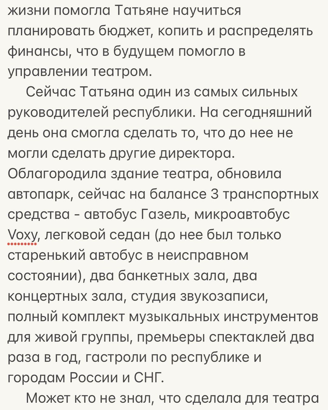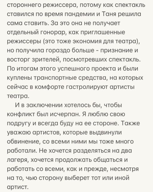 — Про Татьяну Чаранскую сейчас говорят все кому не лень и я давно хотела написать свое мнение на эту тему. С @charanskaya мы познакомились в Театре эстрады в 2002 году, когда я устроилась туда в качестве артистки-вокалистки, Таня тогда работала там режиссером. С тех пор мы близкие подруги. Я проработала там всего два года, ушла из-за того, что условия работы мне не нравились. Многие помнят старое здание театра, которое располагалось в церкви, оно абсолютно не подходило для деятельности театра. Филиппов В.В., директор уже тогда мечтал о новом здании, но так и не смог это воплотить.