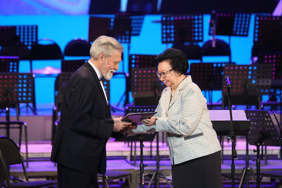 Перед этим номером состоялась еще одна знаменательная церемония. Ректор Высшей школы музыки Надежда Михайловна ЗАЙКОВА поздравила своего коллегу и зачитала приказ о присвоении юбиляру высокого звания «Почетный профессор Высшей школы музыки Республики Саха (Якутия) им. В.А. Босикова», вручила ему свидетельствующий об этом знак. Затем коллеги облачили Станислава Максимовича в профессорскую мантию и одели ему на голову квадратную академическую шапочку.