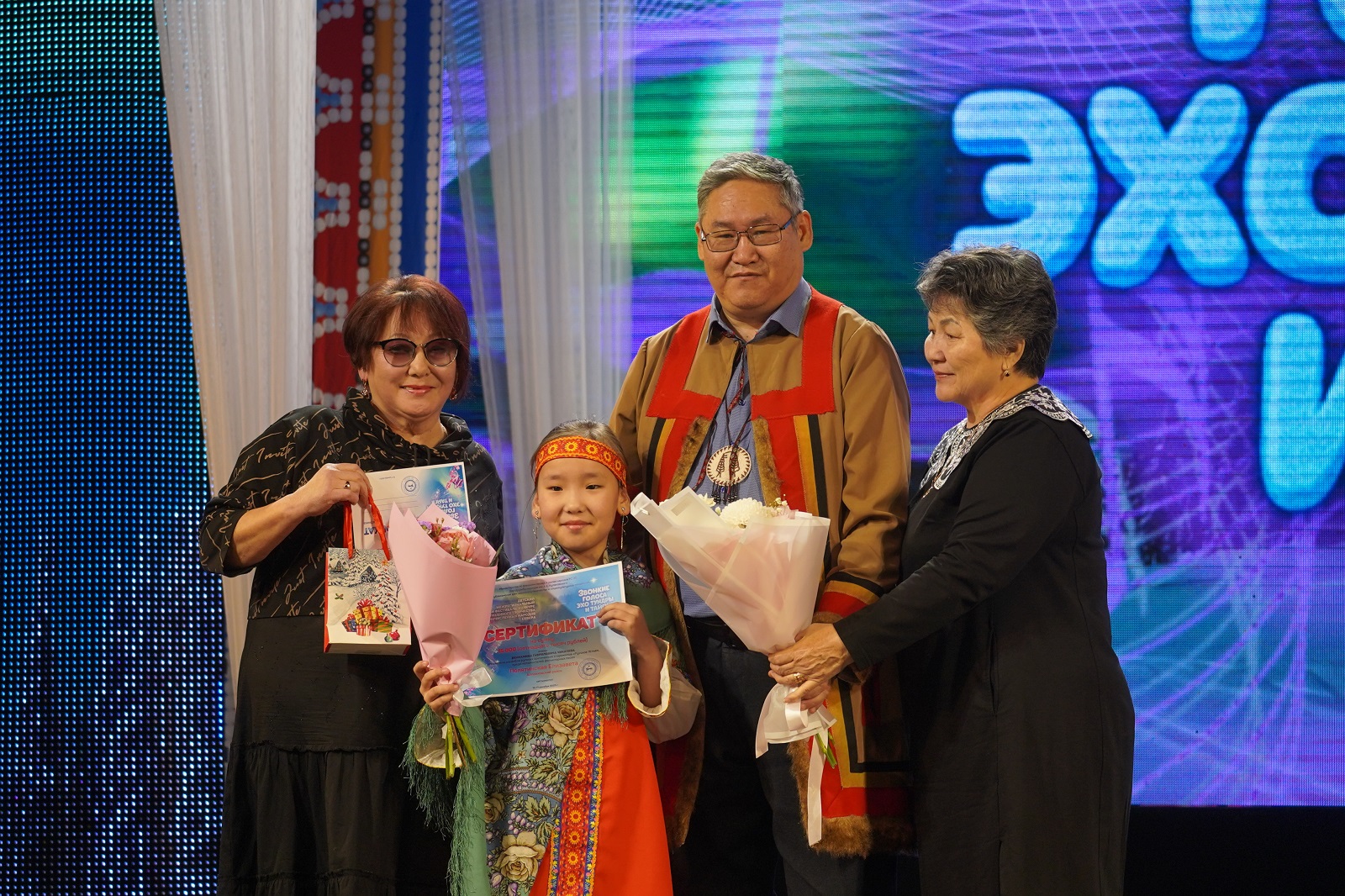 Диплом Победителя в номинации имени Анны Дмитриевны Неустроевой, носителя чукотского фольклора, первого руководителя фольклорного ансамбля «Ярар» Нижнеколымского района среди исполнителей чукотских песен – Арина Каургина, Нижнеколымский район.